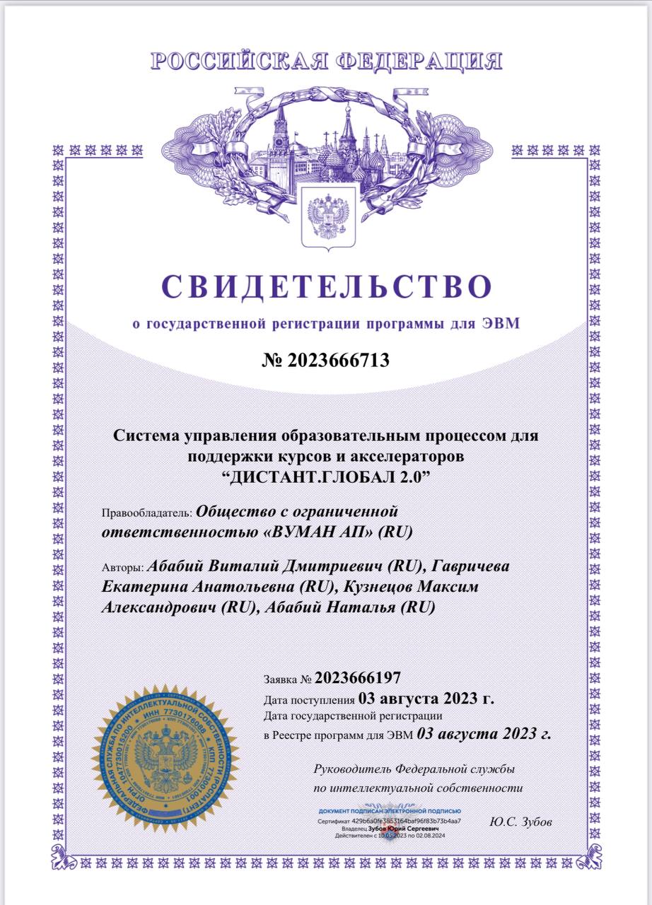 Полное наименование ПО: Система управления образовательным процессом для поддержки курсов и акселераторов «Distant Global».